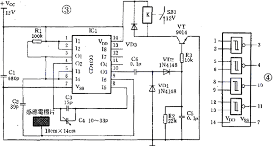 圖3電路所用元件都是普通元件,由於 CD4093為CMOS積體電路,很容易被烙鐵所帶的靜電擊穿,所以在製作時,最好先焊一個IC插座,待電路經檢查無誤後再把CD4093插入插座。感應電極片可以用金屬易開罐剪製。