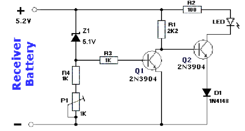 這個簡單的電路可以偵測電池的電壓,當電壓低於由可變電阻 VR1 所預設的電壓時,LED會亮起,實際上VR1及相關的電阻成為Q1 (ON) 的偏壓保持Q2(OFF)使 LED 也是 OFF 的,當電池電壓逐漸降低至所預設的電壓之下,Q1成為 OFF 狀態,轉而使 Q2 成為ON,使 LED 亮起。這個電路可正常工作於 12V 以下的電池。
