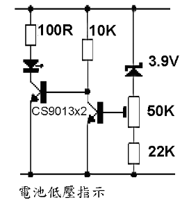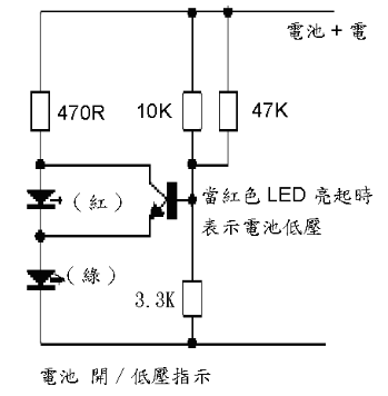 以下這個電路當電池 OK 時它會指示綠色的LED,當成操作期間的電源指示