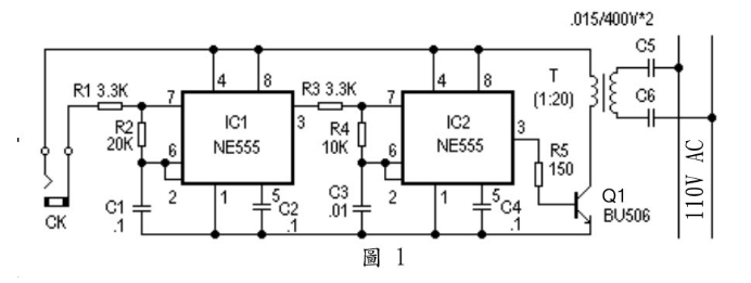 該警報器由發射和接收顯示兩部分組成。發射電路如圖 1 所示。它是由兩顆 555時基電路組成的兩個不同頻率的震盪電路。當 CK 兩端短路時(短路式警報偵測信號),第一顆(IC1)555構成低頻震盪電路,頻率 F1 主要由 C1、R2 決定,3腳輸出頻率為F1 的低頻信號。當 IC1 的 3 腳輸出高電平時,第二顆(IC2)555構成的高頻震盪電路工作,其震盪頻率 F2 主要由 C3、R4 決定,且 F2 遠大於 F1,這樣在 IC2 的 3 腳輸出為F2 的脈波調製信號。該調製信號透過由 Q1、T、C5、C6 組成的驅動電路在電力線上產生高頻調製脈波,高頻調製脈波電壓由傳輸距離選擇。
