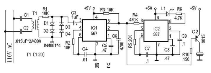 電力線路上有警報的高頻調製脈波出現時,參考圖 2,透過 T1 升壓變壓器的變壓及限流電阻 R1 和D1~D4 的限幅將信號送入第一個頻率鎖相回路模組(IC1)NE567 的 3腳,再由該頻率鎖相回路所組成的頻率識別電路(R2、C4)決定識別頻率值。然後在IC1 的輸出端 8 腳便可接調出頻率為 F1 的低頻頻率。該輸出頻率一路送至 V2 組成的驅動電路以驅動蜂鳴器HD 工作以產生聲音警報;另一路送至第二個頻率識別電路(IC2)。同理,調整 R5、C7 的數值,使第二個頻率解調電路能接調出 F1 的頻率,則(IC2)輸出 8 腳由高電平,L1發光即表示出該發射電路的方位出現警報。