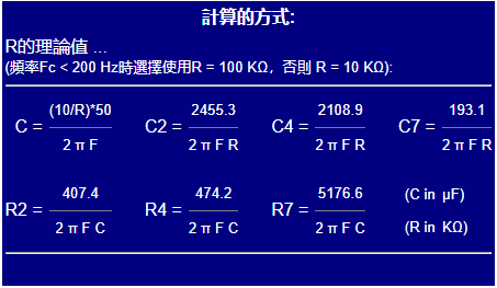 R 的選取規則:頻率 $F_c < 200\text{ Hz}$ 時使用 $100\text{ K}\Omega$,否則使用 $10\text{ K}\Omega$。
