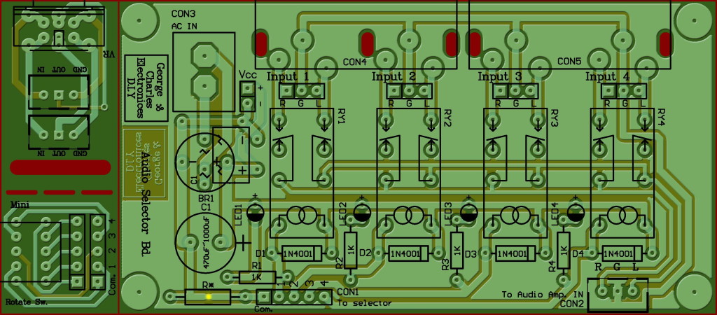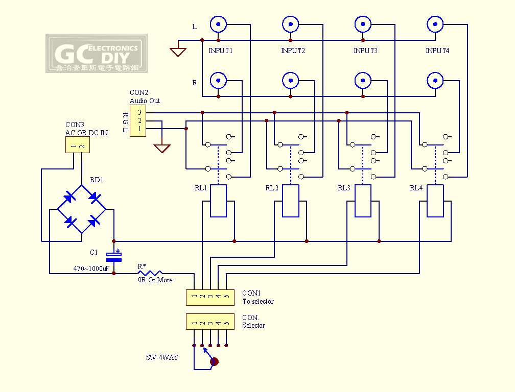為了減低以上這些問題,還是來做個音源入選擇板好了! 但不是像一些設備上的觸控式或電子式的方,這次要做的還是用最簡單的旋轉式波段開關來選擇,為了縮短音源線的配線長度,把干擾降到最少,我們利用繼電器來切換音源,並把RCA座直接做在同一片板子上,電路很簡單,請看下圖: