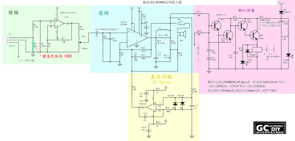 計劃製作一個功率放大器已有一段時間了,為了方便設計選擇以 LM3886 功率IC為基礎,但總覺得不能太簡單只是照著技術文件的內容來的製作,所以在網路上搜尋了不少的文章及電路,發現LM3886也可以加上DC SERVO電路,所以我把LM3886 + DC SERVO + OP 前級 + 喇叭保護器 +電源一起設計在一片板子上,使製作的難度降到最低。(,原圖參考大陸網站[松勝電子])