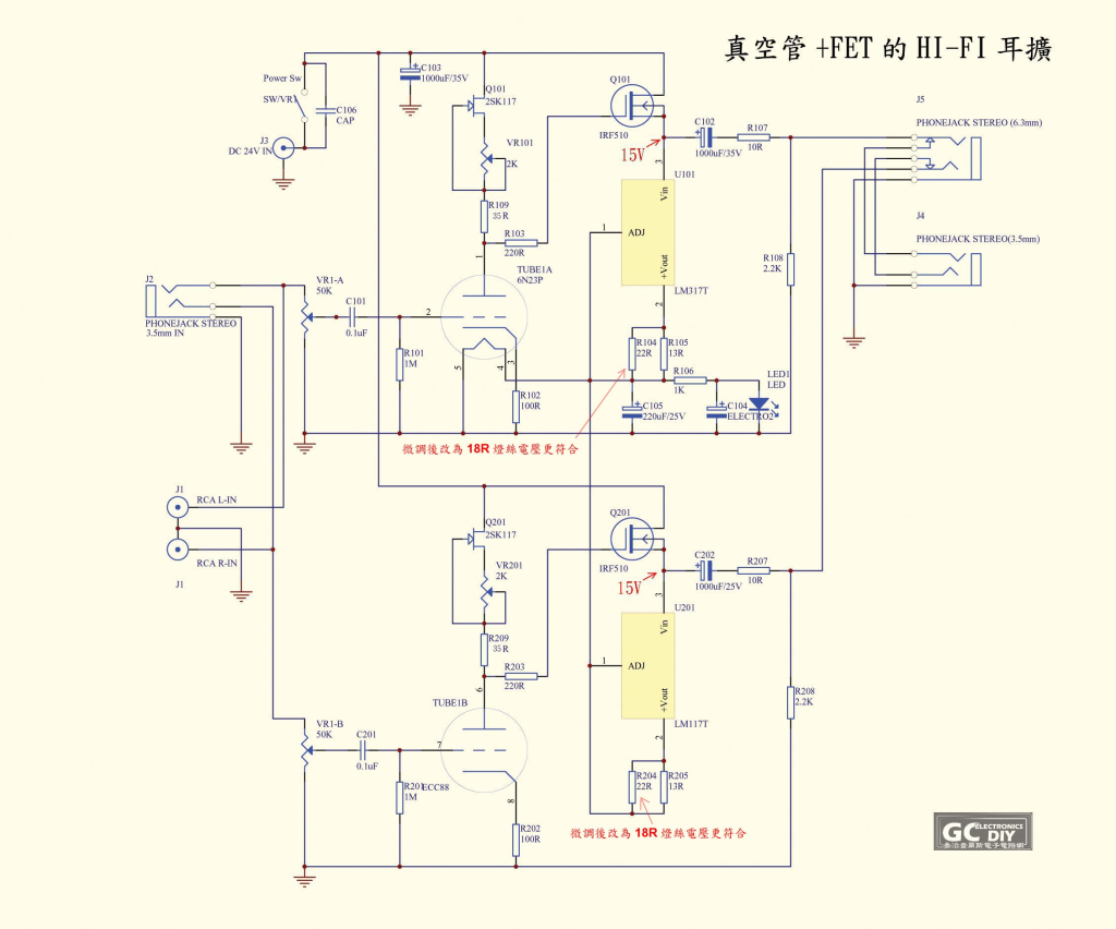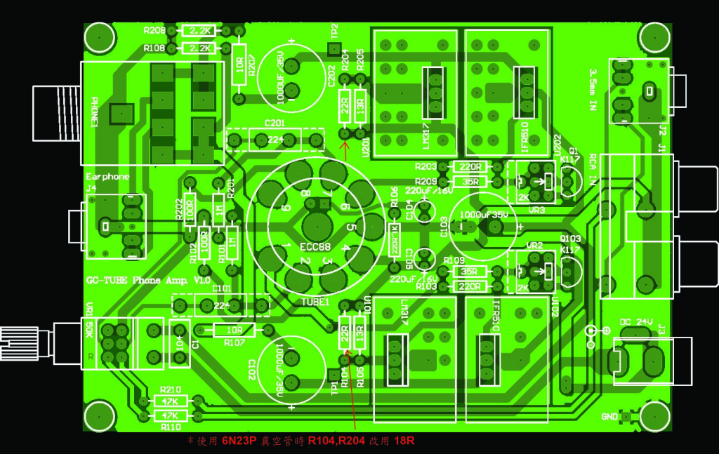 - R104,R105從電路圖中可以看出來是併聯的,R104,R204原圖使用的數 值是一個22R(歐姆)併聯一個13R為的是得到更精確的阻值,這組電阻配合LM316做為限流的工作,讓真空管的電流在額定的電壓電流中運作, 若配合我能供應的6N23P這顆雙3極管的電流目前的數值 可以改為18歐姆,如果您不是使用這個型號的真空管,而是換用了其它的相容管,因 使用LM317定了電流, 所以在真空管燈絲上的電壓可能不是6.3V了,此時你就要適時的改變這兩顆電阻,讓真空管燈絲上的壓降為6.0~6.3V。 (註記, 把有網友更換真空管型號時在此說明:vincent0610網友使用過Tesla E88CC code37(此阻值可以不更換或使用阻值在20~23歐姆間的電阻替換 )