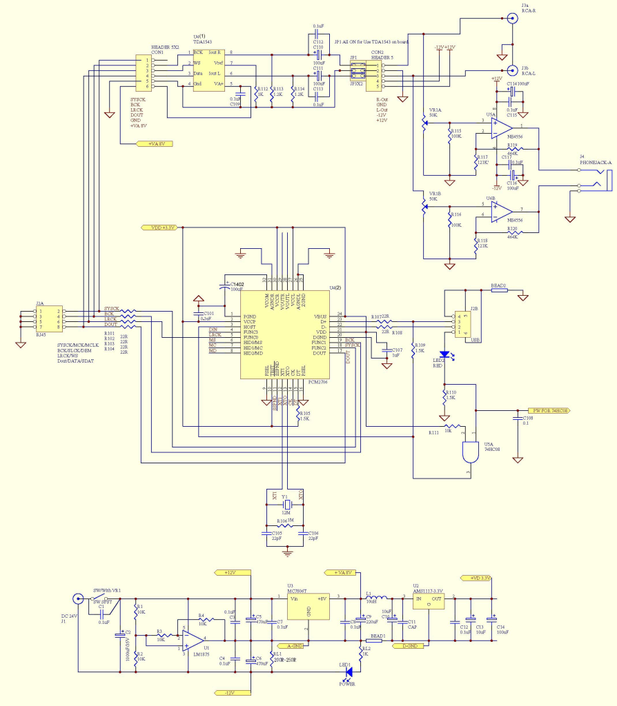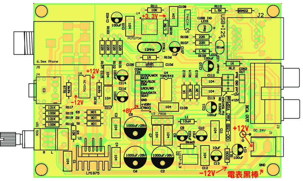 另外再從+12V經一7805穩壓IC產生+8V來供應TDA1543的源,並再從這+8V經L1117-3.3V來產生+3.3V來供給PCM2706的供電。