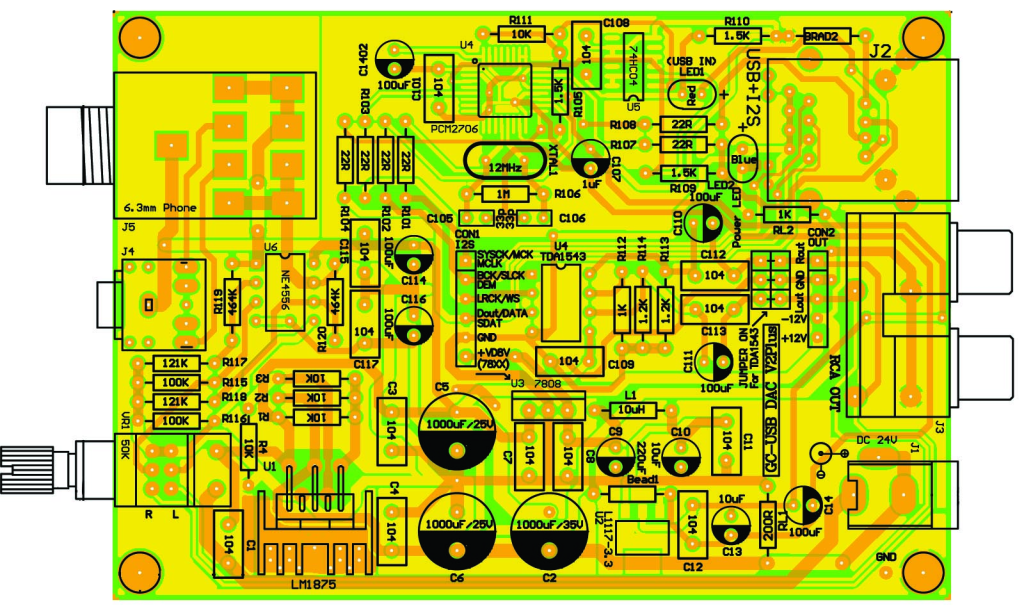 - 此時電腦播放音樂就會由DAC輸出, 電路板內已內建RA1耳擴電路,雖非頂級電路,可以當成監聽,效果算是不錯,直接插上你的耳機,3.5mm或6.3mm的立體耳機,擇一插到前方的插座上,調整VR到試當音量,好好享受你DIY的成果!