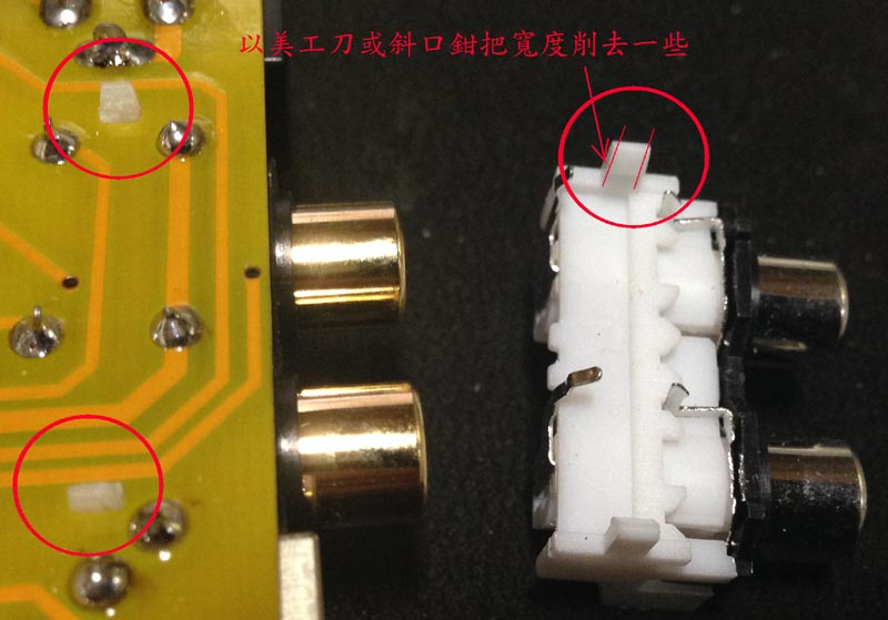 - RCA坐的兩側有固定插梢,對應電路板上的固定孔,如果覺得太緊不好插進去,可以如下,用美工刀或斜口鉗把插梢的寬度削窄一點。