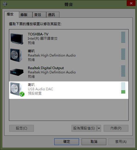 - 打開DAC電源後LED2會亮起,以Windows作業系統連接會自動辦認並安裝Driver, 不需再手動安裝,可以開啟控制的的音效看看。