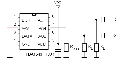TDA1543 的輸出電流 Ifs 標準值是 2.3mA,允許的電壓擺幅在 1.8V 到 VDD – 1.2V 之間,所以如果你用 8V 供電,輸出電壓的擺幅就在 1.8V 到 6.8V,中點在 4.3V。