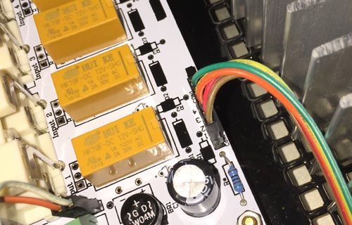 10.配線安裝: 配線的安裝就沒有一定的順序,下面幾個重點的解說: (1)電源開關背光LED板配線,標準電壓是DC 12V,電路板上有+-標示,照著接就好,如果你用更高的電壓,比如我從『音源選擇輸入電路套件』中整流後的18V左右電壓來當這片背光LED的電,那就要在配線中再串一顆電阻(1.5K)來限流降壓,最好再套個熱縮套。