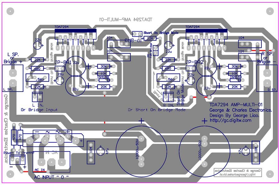如果你下載的是PDF檔,下一頁你可以看到完整電路圖及電路板底片圖(新版LAYOUT),列印時請注意設定輸出比例為100%(不要有任何縮放,曝光時注意正反面,也就是印出的透明片放在感光線路板時,板面上的文字看起來是正常的文字,不是反字。 PDF檔下載:KITs\TDA7294MULT-BTL\TDA7294MULT-BTL-ALL.pdf 這個DIY我們沒有做廠製電路板,後來的做的是加了簡單前級的[可橋接TDA7294可橋接後級-2版],請參參考:可橋接TDA7294可橋接後級-2版 George Liao (2007.06.15) 版權所有,請勿轉載 喬治查爾斯電子電路網